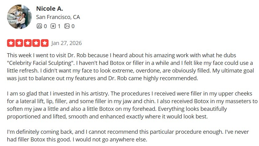 Read the latest reviews for Dr. Rob Berberian from his patients posted on Google and Yelp. We offer FUE Hair Transplant, PRP Hair, Facial Fillers, Botox, Zero Bruising Lip Fillers, Facial Sculpting, PRP Facial, Non-Surgical Nose Jobs, Under Eye Treatments, IV Therapy, Chemical Peels, Ultrasound, Radiofrequency, Hydrofacial, Cryotherapy, Advanced Physician Grade Skincare and much more.